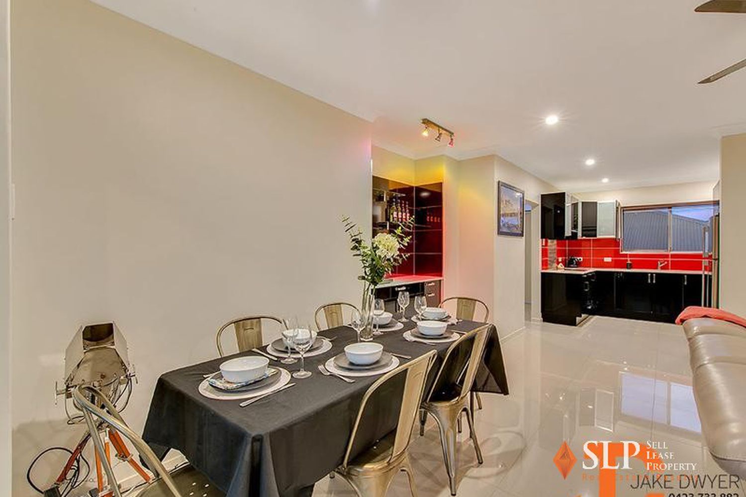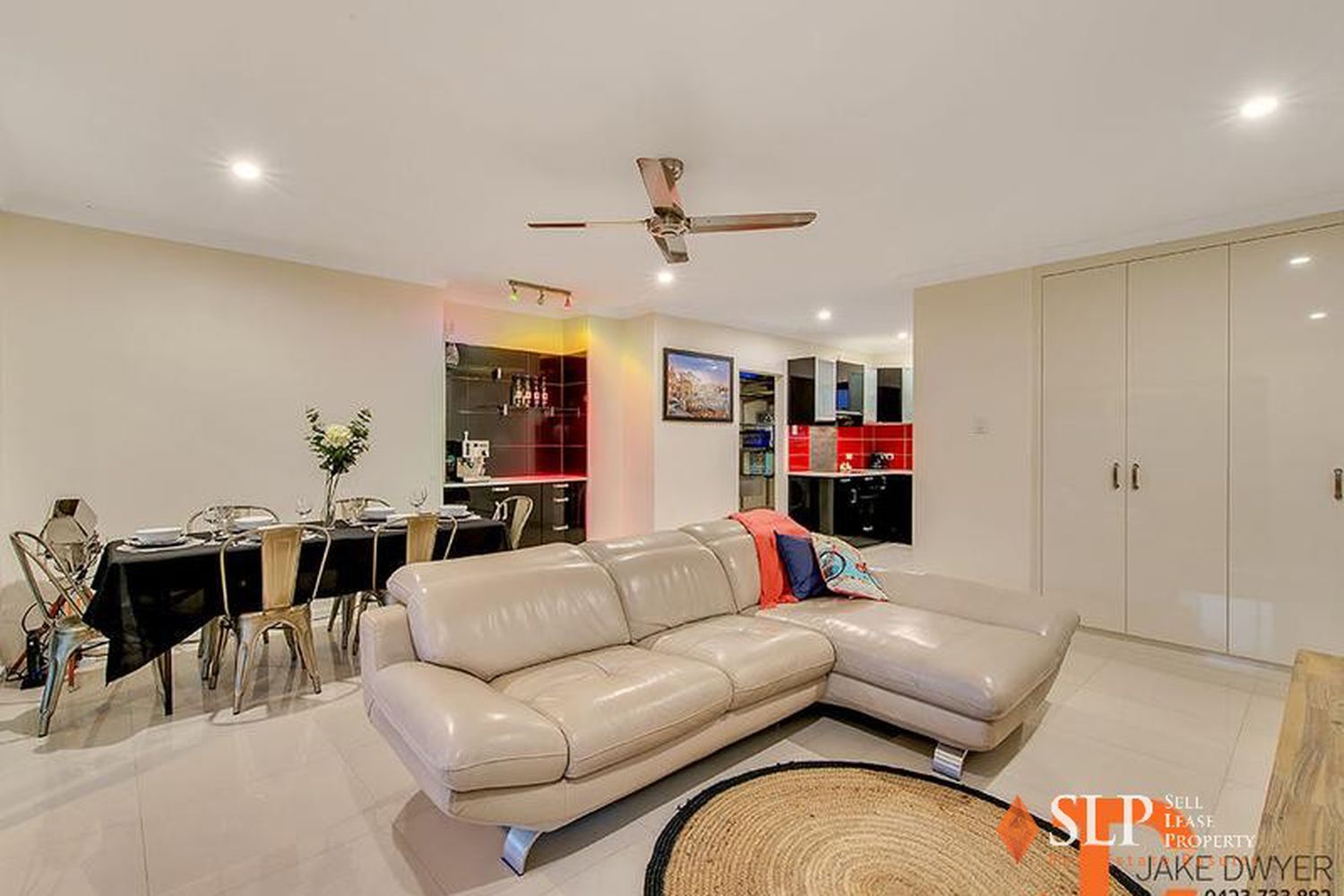 * Open plan living with seamless bright tiles