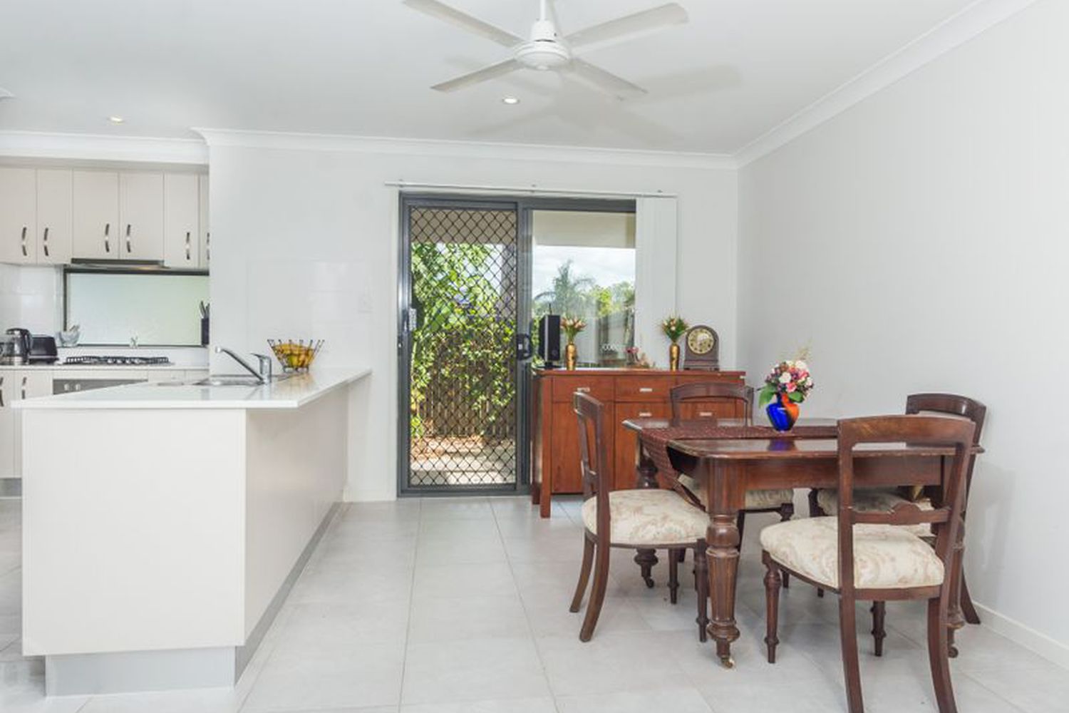 Upon entry to the home, you are welcomed by sleek white interiors and porcelain tiles which feature in the open plan living, dining and kitchen. The contemporary kitchen is filled with an abundance of inclusions such as Caesarstone benchtops, gas cooktop, premium stainless steel appliances and ample bench space and storage.